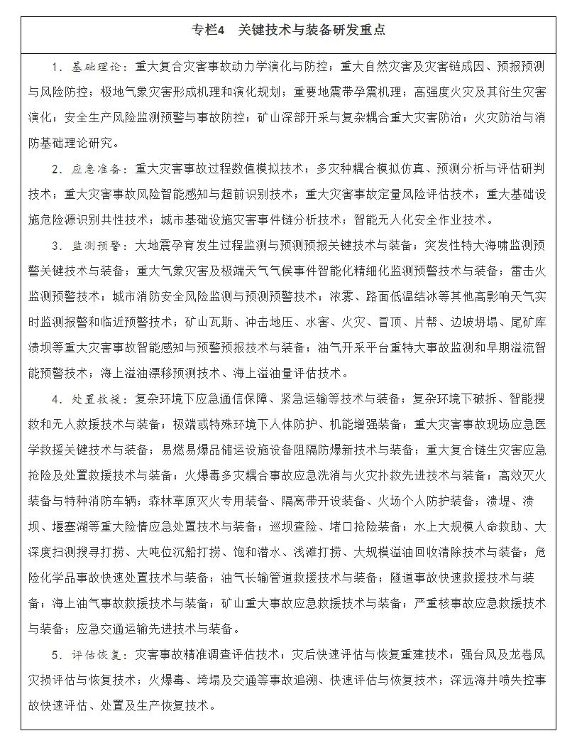 建设重大自然灾害风险综合防范、重特大生产安全事故防控、复合链生灾害事故防治、城市安全与应急、矿山重大灾害治理、防汛抗旱应急技术、应急医学救援等国家级实验室和部级实验室。建设地震科学实验场和地震动力学国家重点实验室。实施大灾巨灾情景构建工程。建设火灾防治、消防救援装备、防汛抗旱和气象灾害防治、应急救援机器人检测、无人机实战验证、应急通信和应急装备物联网、大型石油储罐火灾抢险救援、城市跨类灾害事故防控、煤矿深部开采与冲击地压防治、高瓦斯及突出煤矿灾害防治等研究基地。依托现有机构完善危险化学品安全研究支撑平台。优化自然灾害领域国家野外科学观测研究站布局。建设应急管理领域国家科技资源共享服务平台和重点灾害地区综合防灾减灾技术支撑平台。完善区域地球表层、巨灾孕育发生机理等模拟系统和国际灾害信息管理平台。
