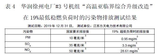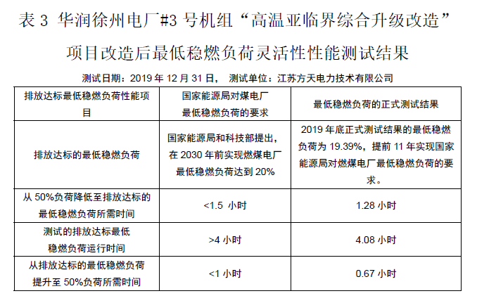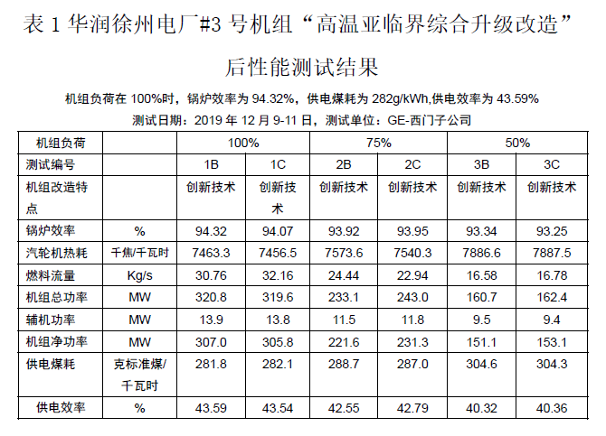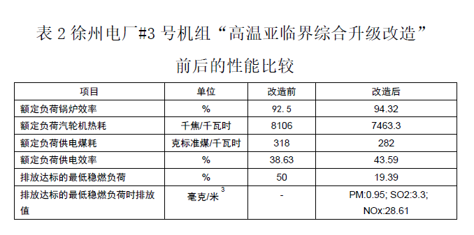 华润徐州电厂#3号机组“高温亚临界综合升级改造”是一项煤电机组改造的重大技术创新,它把亚临界机组一步提升到超超临界机组的水平。如表1和表2、3、4所示的徐州电厂#3号机组性能测试结果和改造前后的性能对比及深度调峰、超低排放等测试结果,充分说明了华润徐州电厂#3号机组“高温亚临界综合升级改造”的改造成果,应适时向全国推广应用。